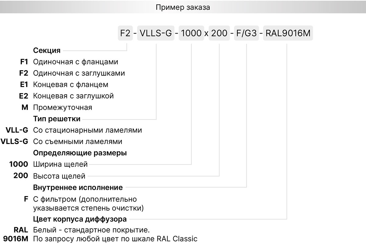 Используемые материалы. Щелевые решетки VLL-G и VLLS-G изготавливаются из экструдированного алюминиевого профиля АД31 по ГОСТ 22233-2018. По умолчанию корпус решетки окрашивается в стандартный белый цвет RAL 9016М матовый, а внутреннее исполнение в чёрный цвет RAL9005М матовый. По индивидуальному заказу возможна окраска в любой цвет по шкале RAL. Статическая камера изготавливается из оцинкованной листовой стали 0,4 - 1,5 мм в зависимости от размера и пожелания заказчика. По умолчанию все изделия поставляются в неокрашенном виде.